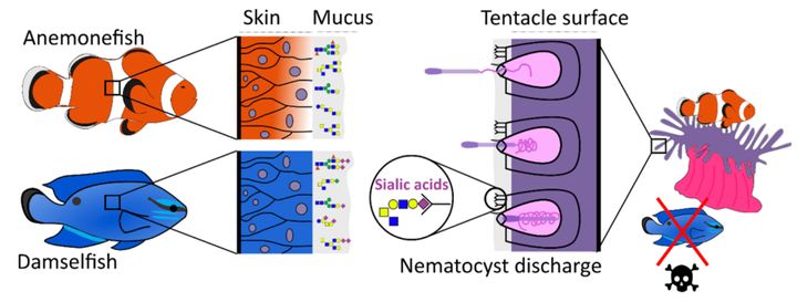 まだイソギンチャクと共生する準備ができていないクマノミの幼魚は、皮膚のシアル酸が通常値であり、イソギンチャクに近づくと刺されます。