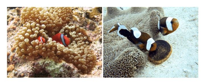 沖縄に生息するクマノミ類(左:トマトアネモネフィッシュ, 右:サドルバックアネモネフィッシュ)/ Credit: OIST – 解き明かされた海の謎:クマノミはなぜ宿主イソギンチャクに刺されないのか(2025)