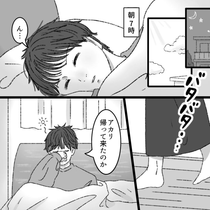 アカリは、翌朝7時に帰ってきたようです。