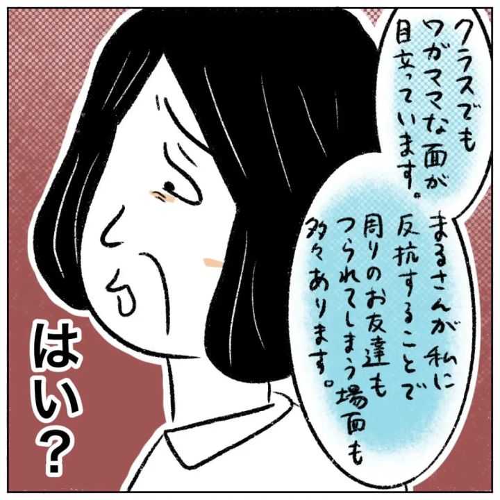 先生は「クラスでもワガママな面が目立っています。まるさんが私に反抗することで周りのお友達もつられてしまう場面も多々あります」と、先ほどとは打って変わってまるさんの問題点を話し始めました。