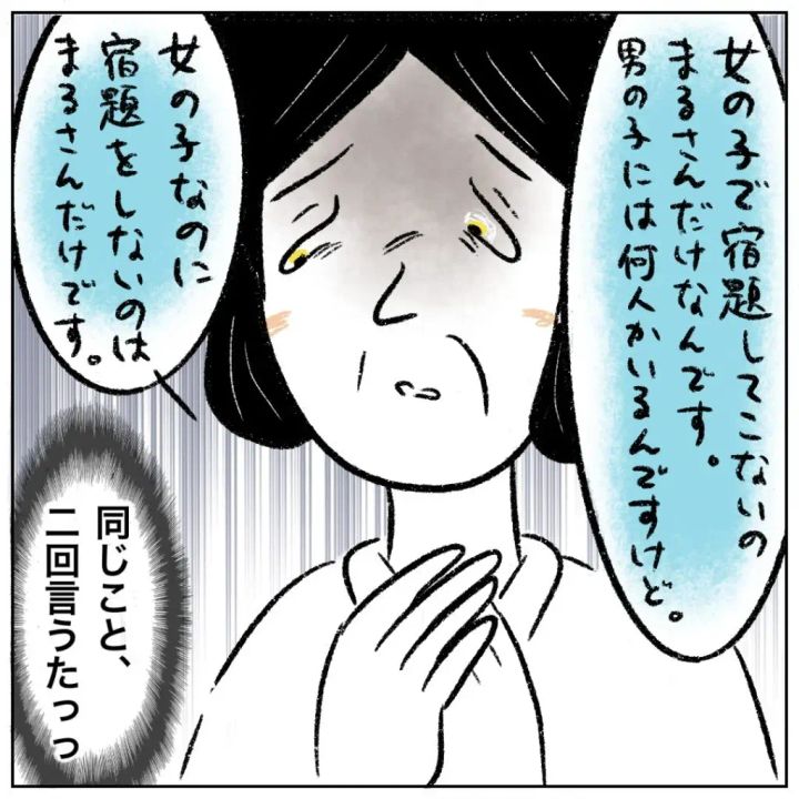 そして先生は「女の子で宿題してこないのまるさんだけなんです。男の子には何人かいるんですけど」と言った後、「女の子なのに宿題をしないのはまるさんだけです」と同じことを二回言いました。
