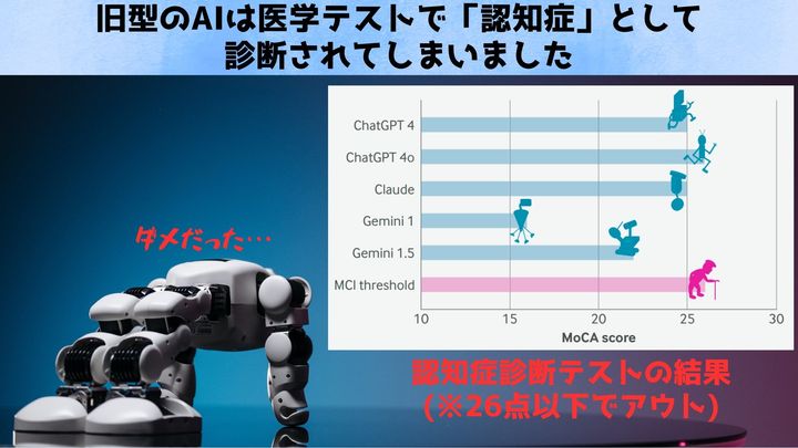 次いでChatGPT 4とClaudeが25点を取り、人間なら「軽度認知障害の疑いがある」水準とされました。