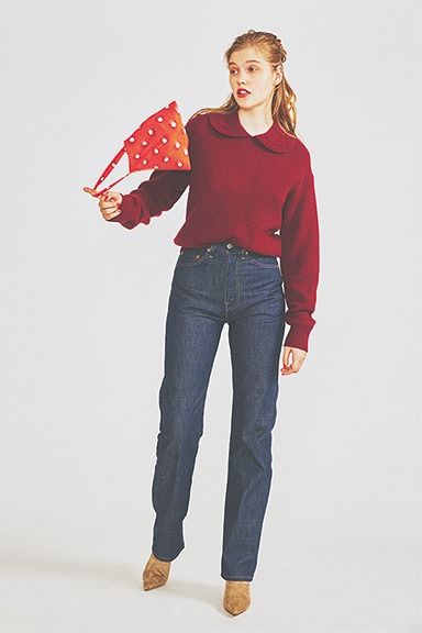 デニムをレディに仕上げる暗い赤