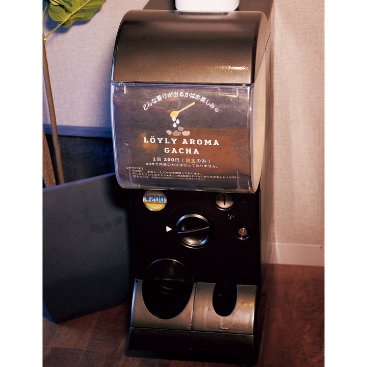 入り口にあるガチャガチャは200円を投入し回せば、ロウリュウ用エッセンシャルオイルが。5種の香りがランダムで楽しめる。