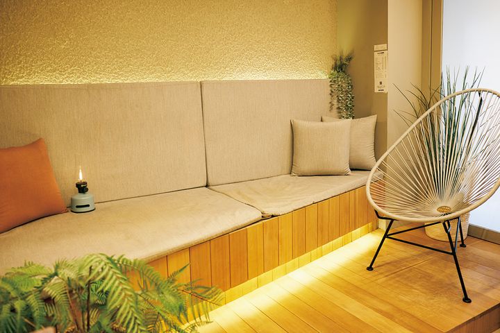 休憩スペースではゆっくりしたり、着替えも。サウナ着やハットもレンタルできるので気軽に女子会ができます。