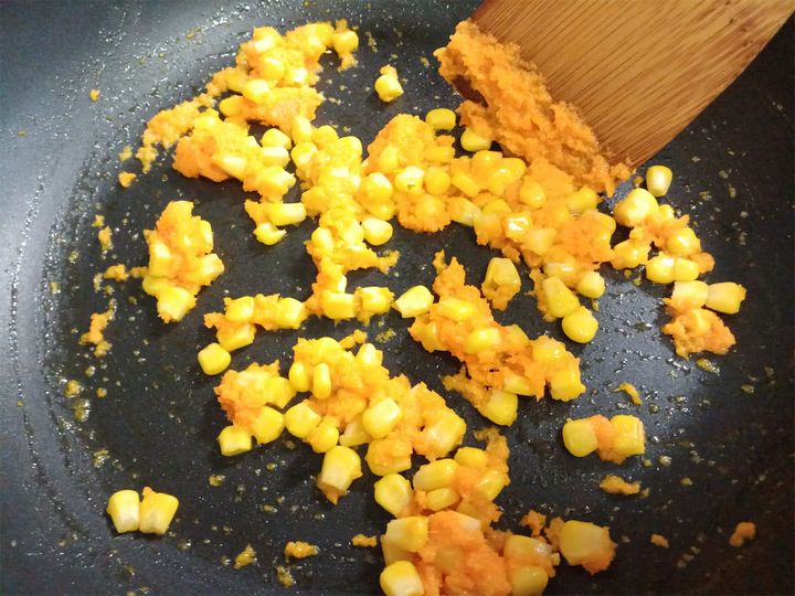 2. フライパンにバターと1のにんじんを入れて炒めて、バターが溶けてきたらコーンを加えて炒める。