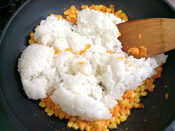 3. 2に、ご飯を加えて混ぜ合わせる。