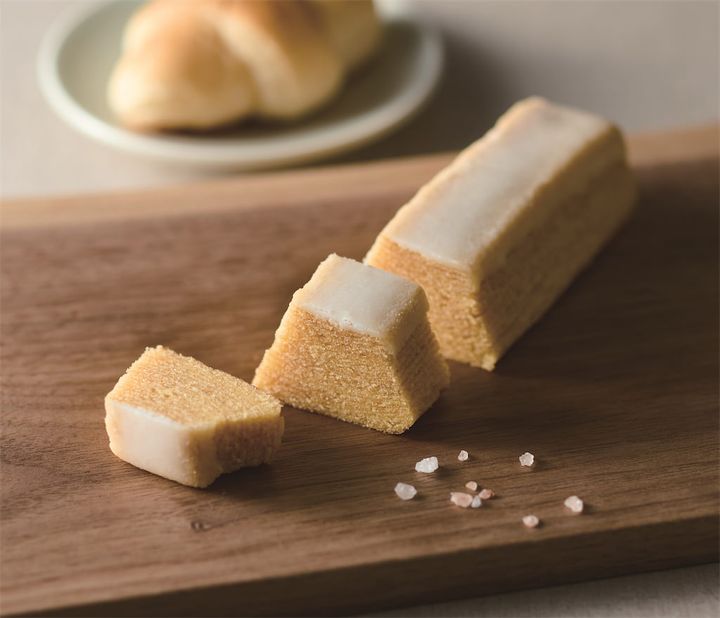 愛媛県発祥の塩パンをイメージ。発酵バターと岩塩を生地に練り込み、塩味のきいたアイシングをかけたスティック型のバウム。