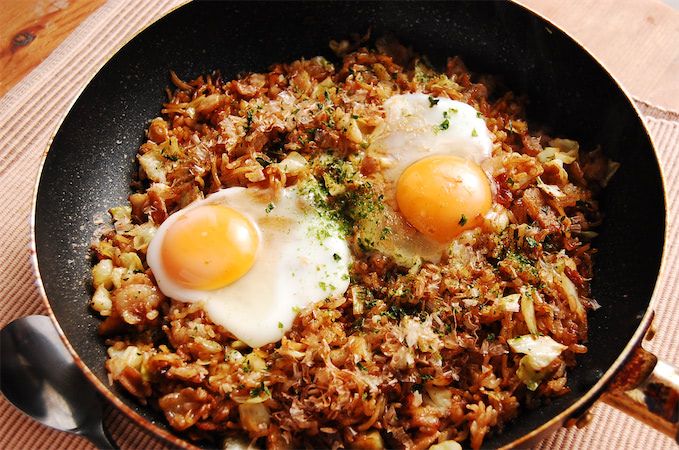焼きそばに比べて、麺とご飯を組み合わせたそばめしはボリュームも満点です。