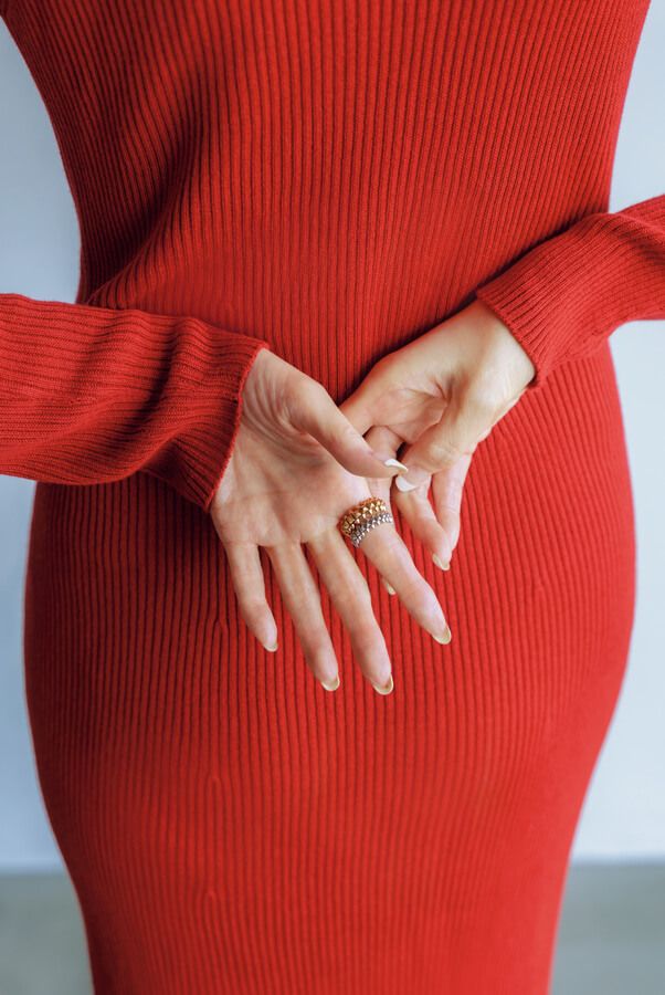 ピンクゴールドとホワイトゴールドの2本づけで手元にリュクスな奥行きを。潔い、ヴィヴィッドな赤ワンピに、スパイシーなリングがよく映える!