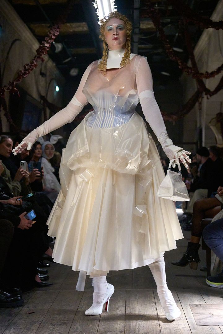 ふたりの初コラボレーションシューズをフィーチャーした2024年春夏アーティザナルコレクションショーは大成功を収め、ガリアーノがメゾン マルジェラMAISON MARGIELA)で歩んだ10年間の集大成となった。「それは完璧なものでした」とルブタン。霧雨が降り注ぐ夜、アレクサンドル3世橋のたもとにガリアーノが作り上げたのは、1930年代のボワット・ド・ニュイ(フランスのナイトクラブ)のような世界観。それはパット・マクグラスによる一度見たら忘れられないビューティールックとも相まって、まるで写真界の巨匠ブラッサイが切り取ったような瞬間となった。