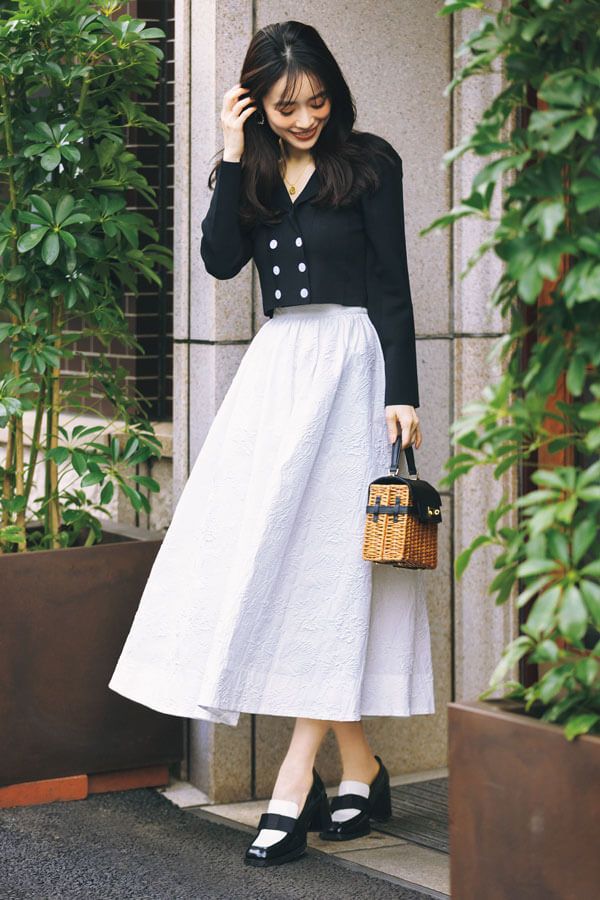 ローファー¥12,100/31 Sons de mode(ヒロタ) ニットジャケット¥13,200/ココ ディール スカート¥101,200/オスロー(フィルム) バッグ¥27,500/ヴィオラドーロ(ピーチ) イヤリング¥3,190/アネモネ(サンポークリエイト ネックレス¥9,900/チビ・ジュエルズ(チビジュエルズ・ジャパン)
