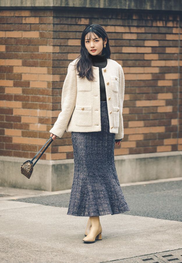 まだ寒い時期は、ニットソー にアウターを重ねてウォーミーに。ジャカードのマーメイドもグッドレデ ィで可愛い♡