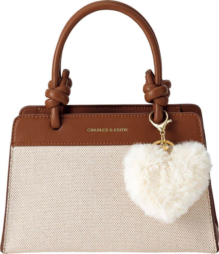 素材にカジュアル感のあるキャンバストートは、チェーン系だとちょっとチグハグ…。色を合わせたファーのハートで、品と甘さを足すのが正解です!
