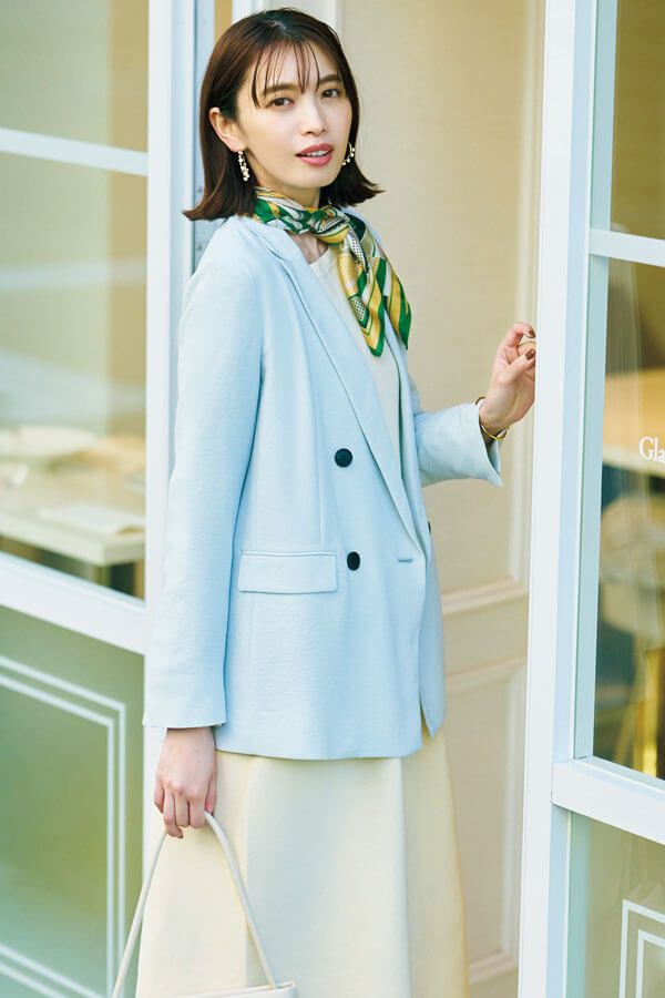 遊び心と華やかさを演出できる春のトレンドアイテムであるスカーフでジャケットスタイルを着映えさせて。コンサバ感が強くならないよう、春カラーと合わせるのがしゃれさせる秘訣。
