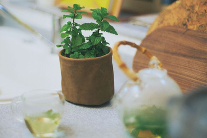 ガラスが大好き。まんまるフォルムのルックスと耐熱性に惹かれたポットを大事に使っています。ミントは鎮静効果があるしすっきりするから夜にぴったり。ミントはキッチンで育ててます!ポット¥31,790(関口ベーカリー)