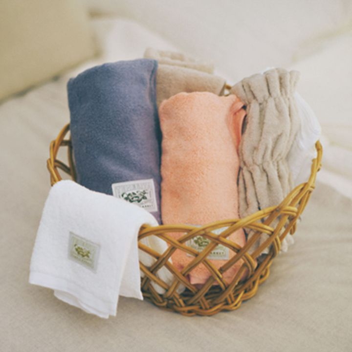 「タオルには人一倍こだわりがあって、いろいろ試した結果“テネリータ”に行きつきました。バスタオルは厚すぎず大きすぎないサイズが最高。特にお気に入りがヘアタオル!シャーリング効果で、巻くだけでしっかり止まるの」