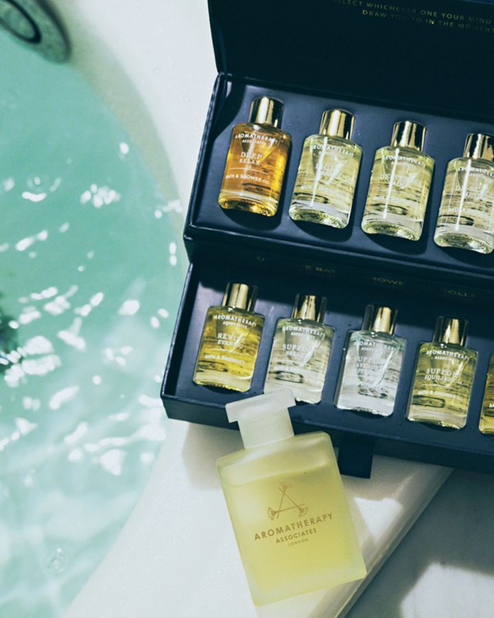 上_気分で選べるミニサイズのセット。ボックス入りなのでギフトにも。アルティメットウェルビーイング N(9ml×10)¥16,280、下_フォレスト バスアンドシャワーオイル55ml¥11,550(ともにアロマセラピー アソシエイツ)
