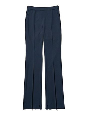 「すその内側にあるファスナーを開閉すると、スリット風デザインに変化するセンタープレスまで入った、ややフレアなシルエット。ヒザより上の位置からゆるやかに広がる形で、脚が長く見えます」(スタイリスト・出口奈津子さん)
