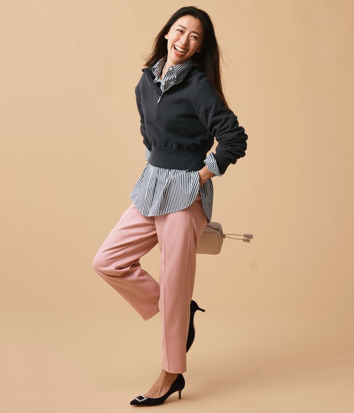 ハーフジップスウェット¥30,800(SEA/エスストア)ストライプシャツ¥22,000(リエス)ピンクパンツ¥36,300(AMACA/SANYO SHOKAI カスタマーサポート)バッグ¥39,600(ヴァジック/ヴァジックジャパン)パンプス¥31,900(ツルバイ マリコ オイカワ)パールネックレス¥22,000(ジゼルベー/ZUTTOHOLIC)バングル¥7,560(アビステ)