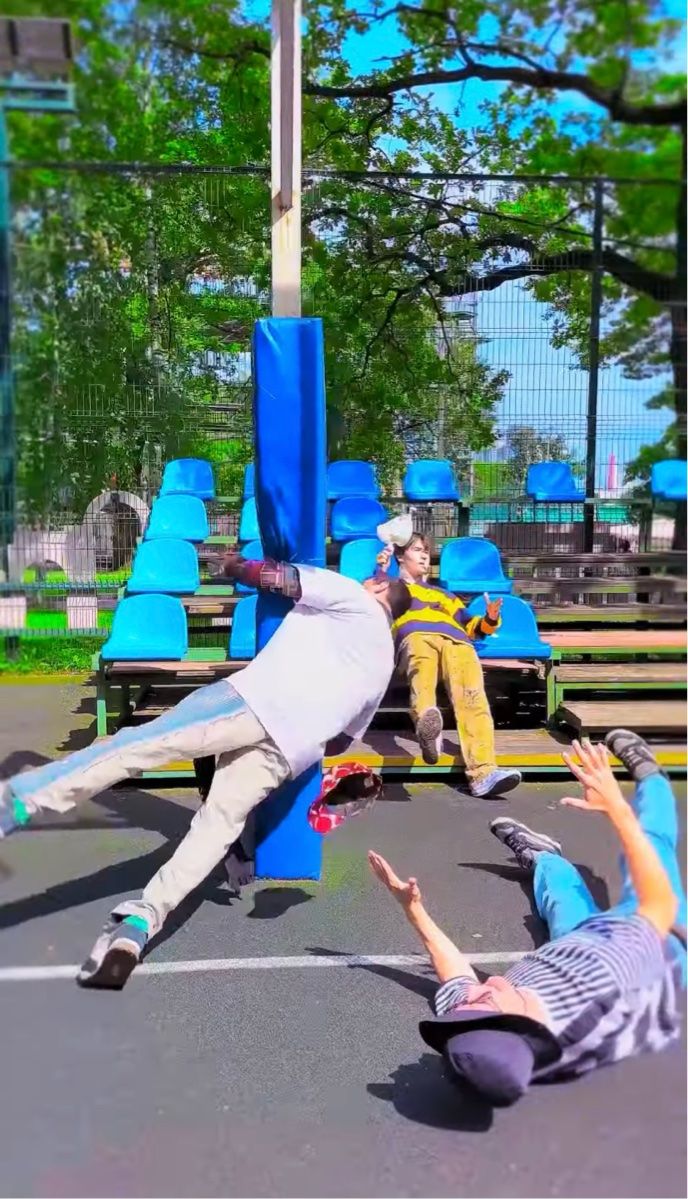 その衝撃でバランスを崩した男性は、体を硬直させたまま地面に倒れ込みました! 柱にぶつかっても無抵抗なその様は、まるでマネキンになったかのようです。