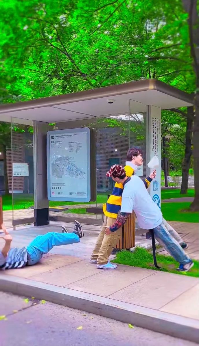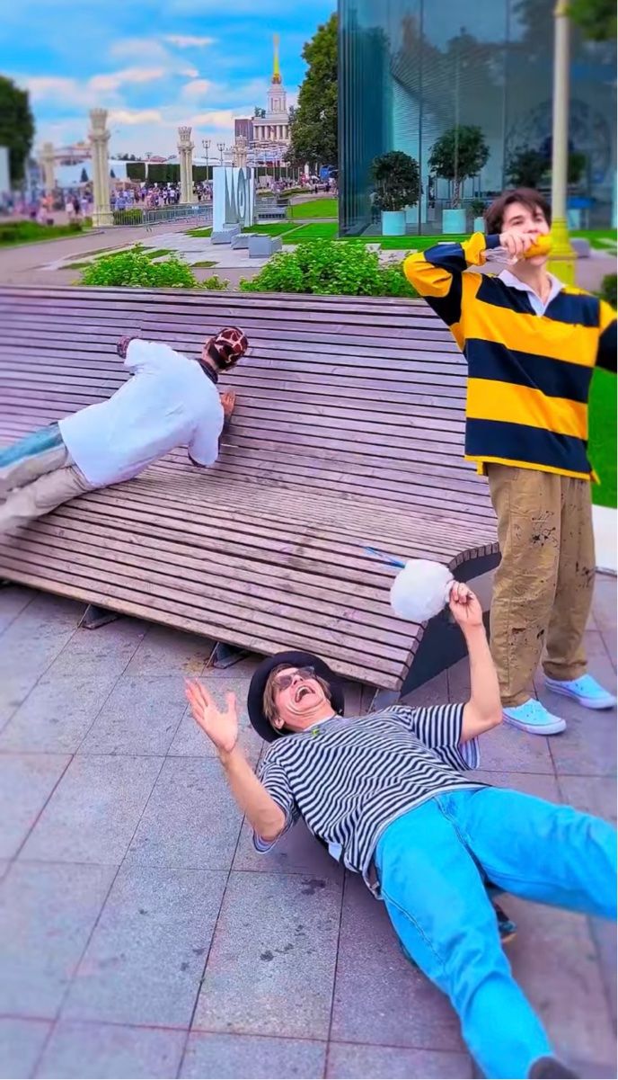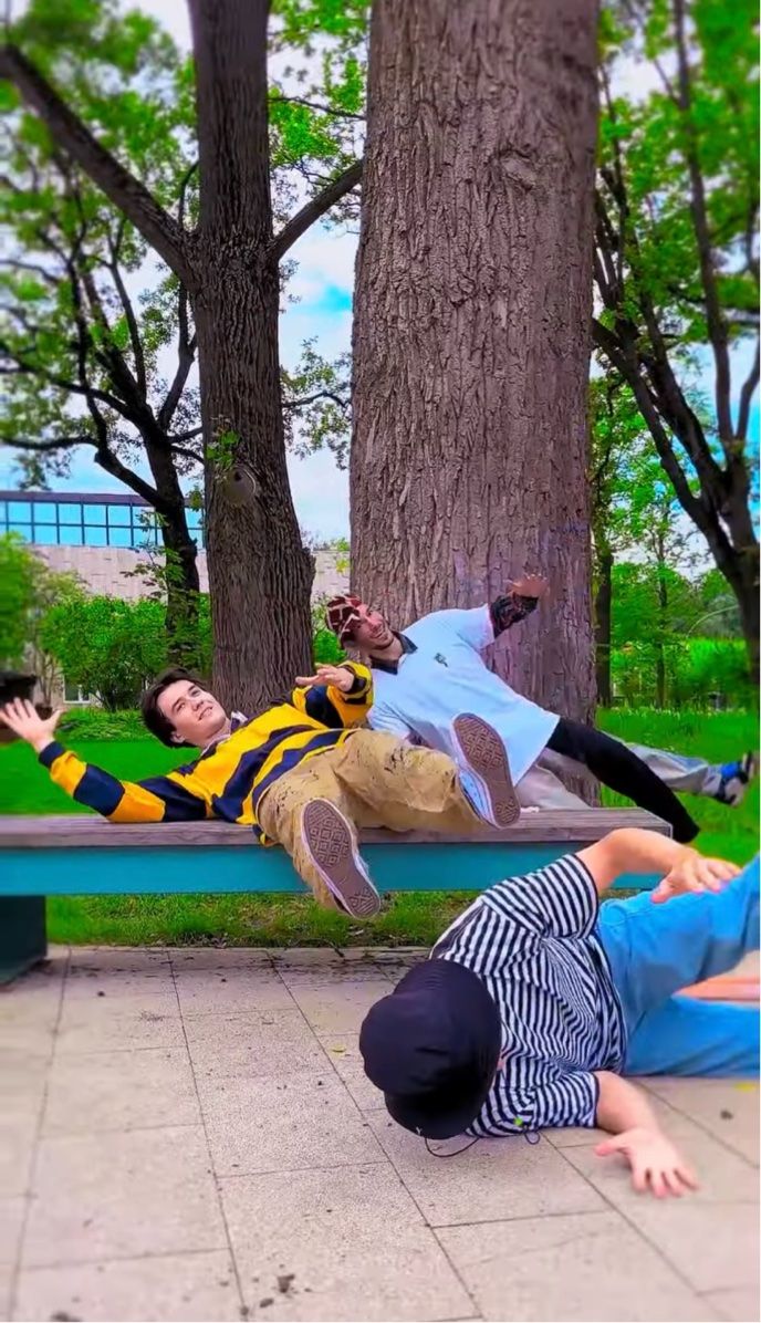 更に今度は、スケボーに乗った男性がベンチに座る男性に直撃! もう一人の男性は、木にもたれかかっていた状態からコテンと倒れ込みました。