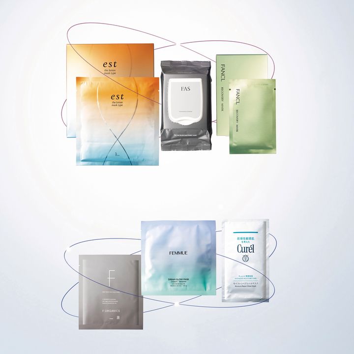 上段左から、つっぱる時には保湿重視のシャバシャバタイプを。est/エスト ザ ローション マスク 5セット入り ¥6,000(エスト)FAS/FAS ザ ブラック デイリー シートマスク 10枚入り ¥6,600(シロク)FANCL/リカバリーマスク[医薬部外品]21ml×6枚入り ¥2,508(ファンケル)下段左から、カサカサな時は美容液たっぷりのとろみタイプを。F ORGANICS/ディープモイスチャー シートマスク 4枚入り ¥3,300(エッフェオーガニック)FEMMUE/ファミュ ドリームグロウマスク(HR) 32ml×6枚入り¥4,840(アリエルトレーディング)キュレル/キュレル 潤浸保湿 モイストリペアシートマスク[医薬部外品]4枚入り ¥1,650〈編集部調べ〉(花王)
