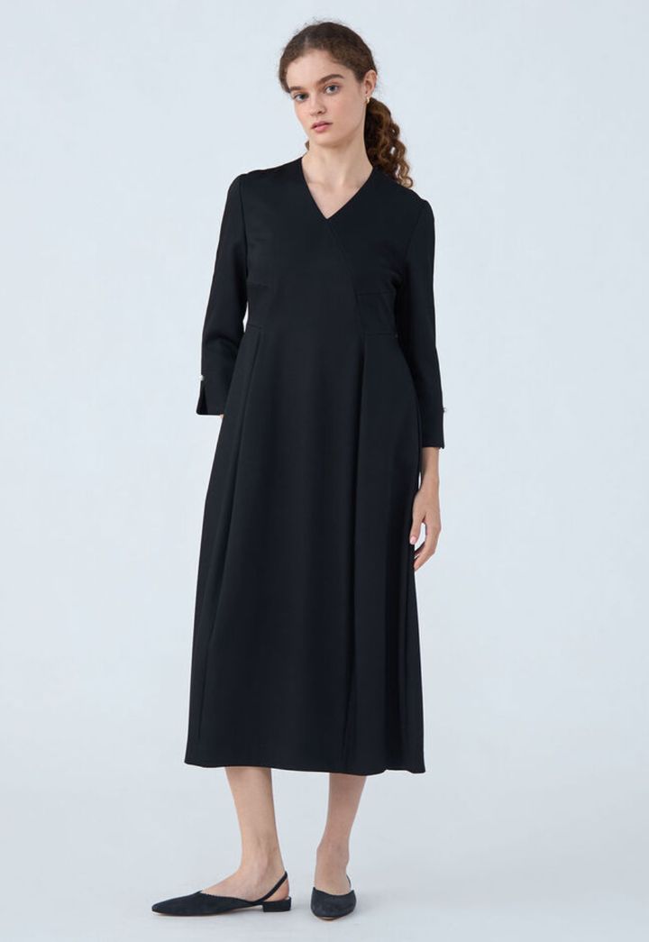 ウエストの切り替えや、胸元の上品なVの開きがシンプルながら、スタイリッシュな印象。ほど良い長さのスリーブ丈のおかげで季節を問わずに着ることができ、幅広いシーンでも活躍する汎用性の高い一枚です。