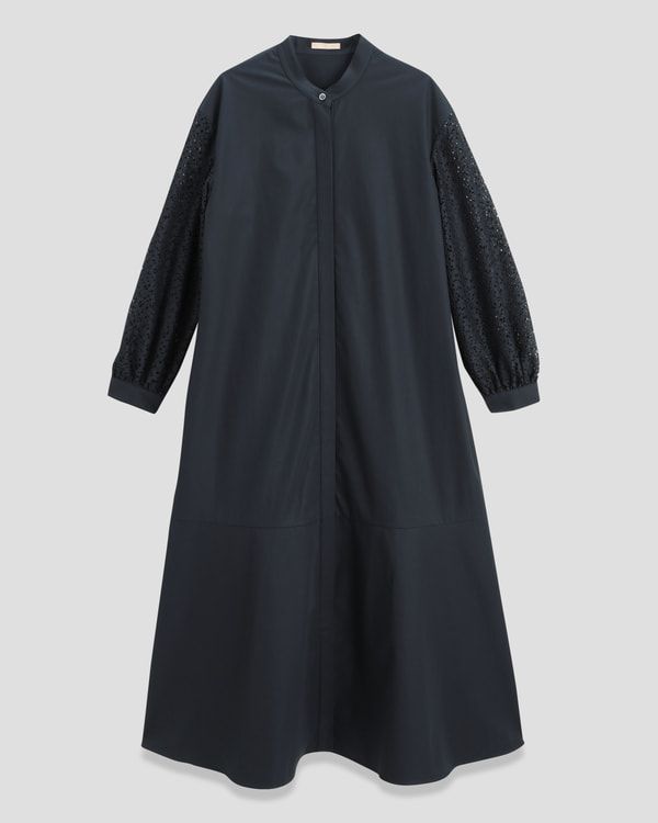 袖部分にレースをあしらった華やかさと軽やかさのあるワンピース。比翼仕立てでフロントのボタンが隠れているので、カジュアル感を抑えてきちんとした印象に。フォーマルにもカジュアルにも対応できるバンドカラーだから、セレモニー以外でも活躍してくれそう。