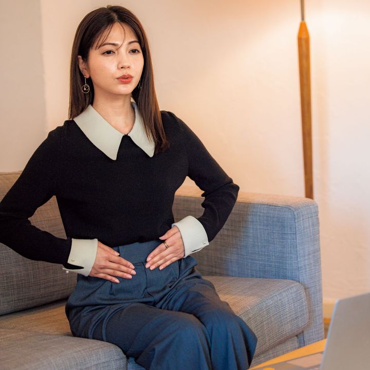 鼻で息を吸いながらお腹を膨らませ、口で吐きながらお腹をへこませる「腹式呼吸」を繰り返して。これができるようになると筋肉の活動量が上がって代謝もアップ。