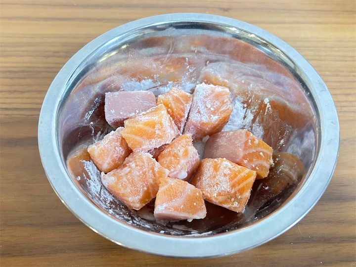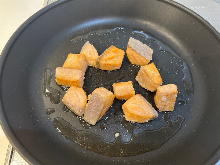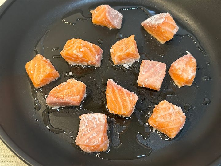 6.サラダ油を引いたフライパンが少し温まったところで、4のサーモンを焼いていきます。