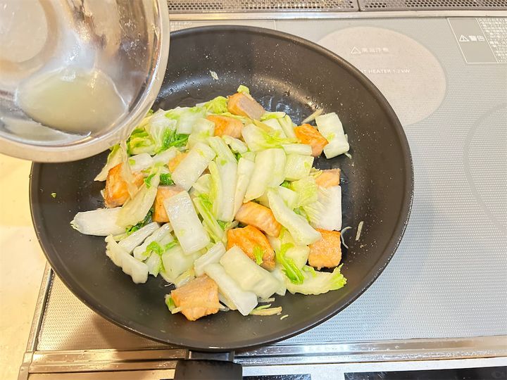 白菜とサーモンをサッと炒めたら、5で用意しておいた合わせ調味料を加えてひと炒め。