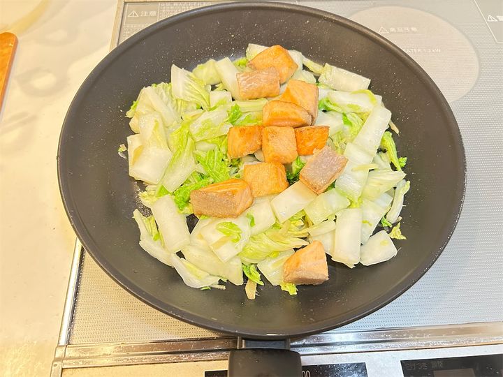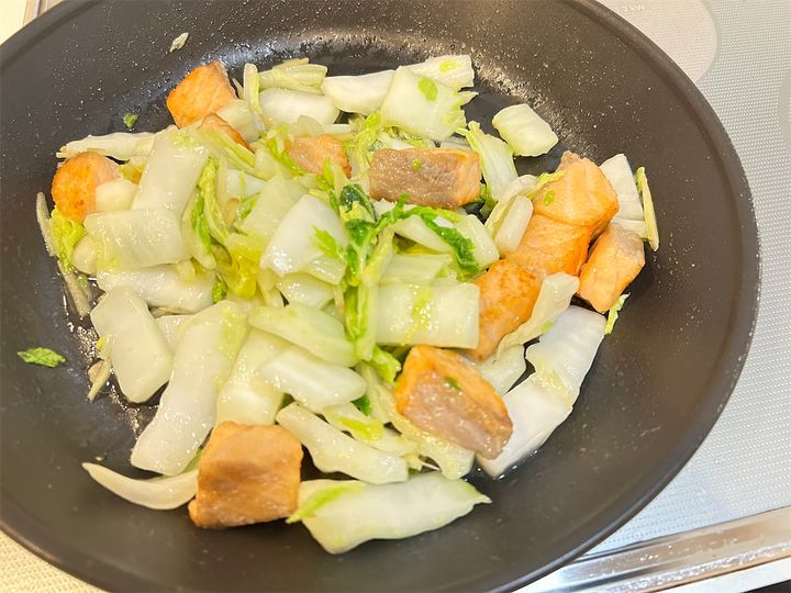 白菜に火が通ったら、6のサーモンを戻し入れて炒めます。