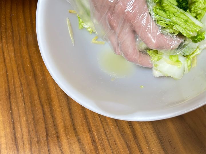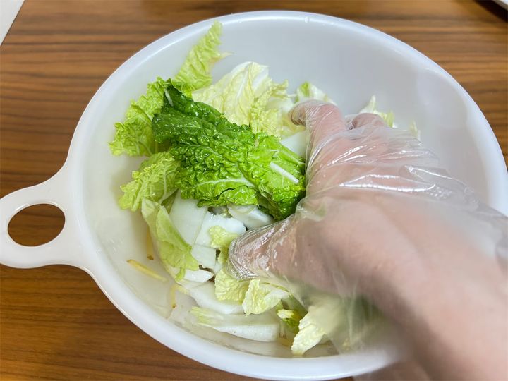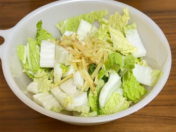 3.ボウルに1の白菜と2のしょうが、塩小さじ1/5、砂糖を入れます。