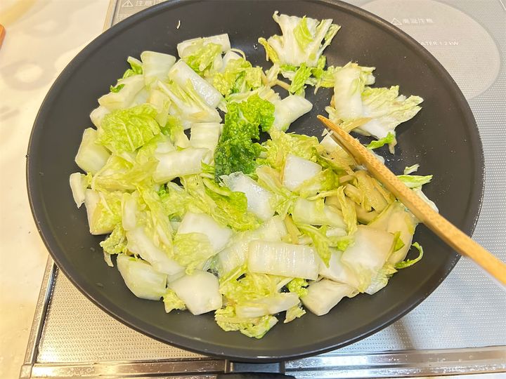7.同じフライパンで3の白菜を炒めます。葉が少ししんなりするまで、中火で1分ほど炒めました。