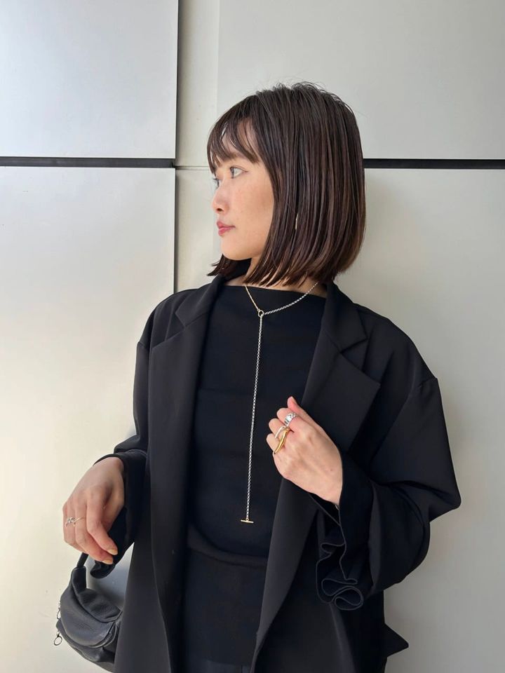 「ブラックのジャケットに映えるジュエリーは、今季からDemiLuxeBEAMSでお取り扱いをしている『ISOLATION』のもの。重ね付けすると手元も華やかになるので、お気に入りです」左手のゴールドのリング¥29,700、左手中指のシルバーのリング¥18,700、ネックレス ¥25,300(全てアイソレーション/デミルクス ビームス 新宿)