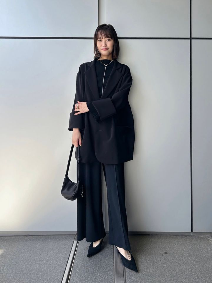 「今季1番にゲットしたのは『COG THE BIGSMOKE』の別注セットアップ。サラッと軽やかで、ほどよいハリとストレッチ性もあり、快適な着心地と美しいシルエットを叶えてくれます。特にパンツは早くもヘビロテ中です!シーズンの始まりと終わりはついブラックカラーに頼ってしまうので、華やかさが出るアクセサリーをポイントにスタイリングしました」
