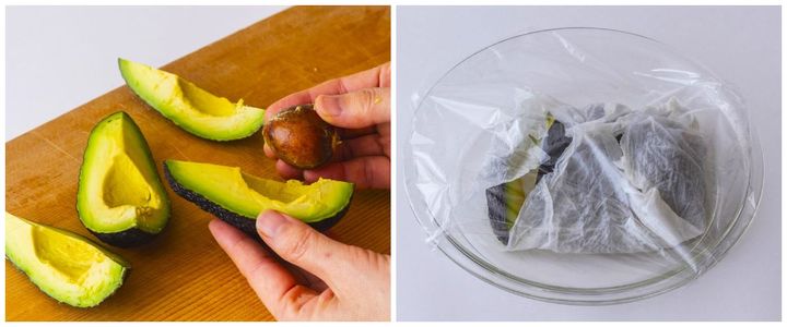 アボカドは縦4等分に切り、種を取り除く。かるくぬらして絞ったペーパータオルで、切り口が下になるようにしてアボカドを包み、耐熱皿にのせる。ふんわりとラップをかけて40~50秒加熱する。まだ堅いようであれば追加で10秒ずつ加熱を。加熱しすぎると味が落ちるので、加熱時間に注意!