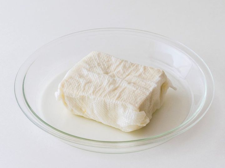 2枚重ねたペーパータオルで豆腐を包み、耐熱皿にのせてラップをかけずに3分加熱。しっかりと水をきりたいときは、加熱後ペーパータオルをはずし、新しいペーパータオルで包みなおし、水分を吸い取って。