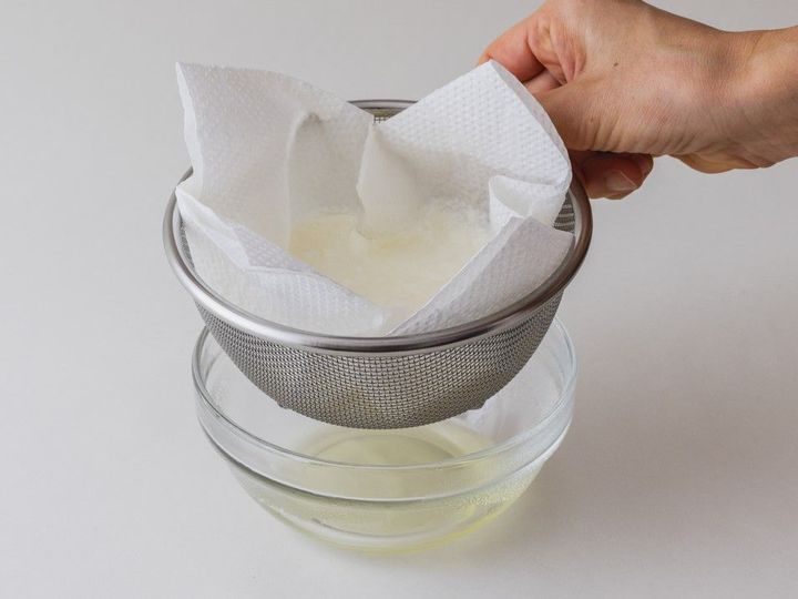 口径15cm程度の耐熱のボールにヨーグルトを入れ、ラップをかけずに2分加熱。ボールで受けたざるにペーパータオルを2枚重ねて敷き、ヨーグルトをあけて粗熱が取れるまで10分ほどおく。