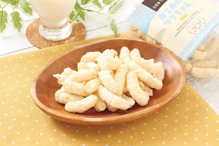 おこめのサクちゃん」は、原料に国産の有機米を使用し、ノンフライ製法で作られています。