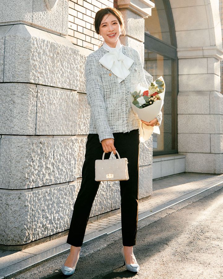 ツイード調のノーカラージャケットは、仕事、ママ友とランチなど幅広いシーンで活躍!リボンブラウスは顔周りをパッと華やかにするので、ハレの日は大きめに結んで。リボンは取り外し可能。細身のテーパードパンツは、伸縮性が高くノンストレスで過ごせそう。どんなトップスとも合わせやすい万能パンツです。