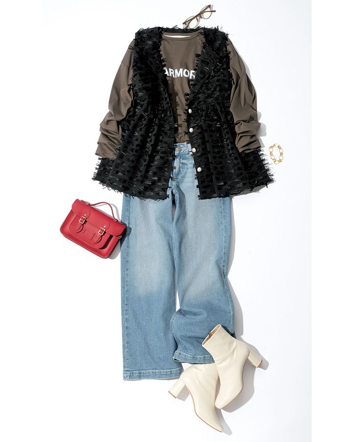 【写真1枚目】ジレ¥7,980(ベベッド)ブラウス¥27,500(yori)パンツ¥17,600(ソーノ/ミラク)バッグ¥19,800(アドカラム/アンソロジー)ピアス¥11,550〈ココシュニック オンキッチュ〉リング¥50,600〈ココシュニック〉
