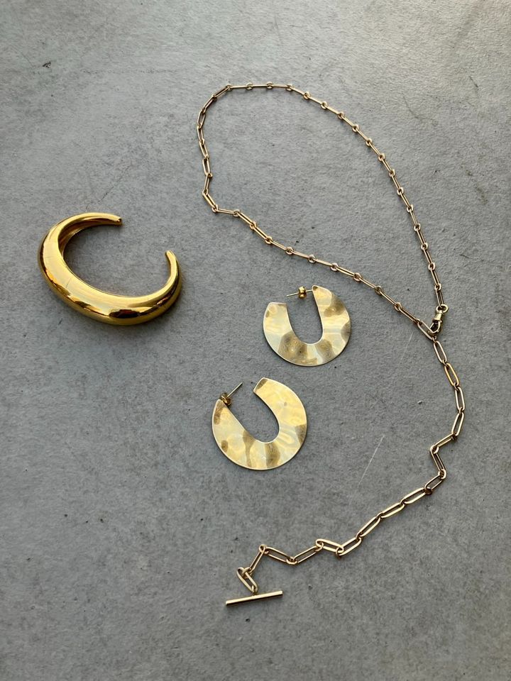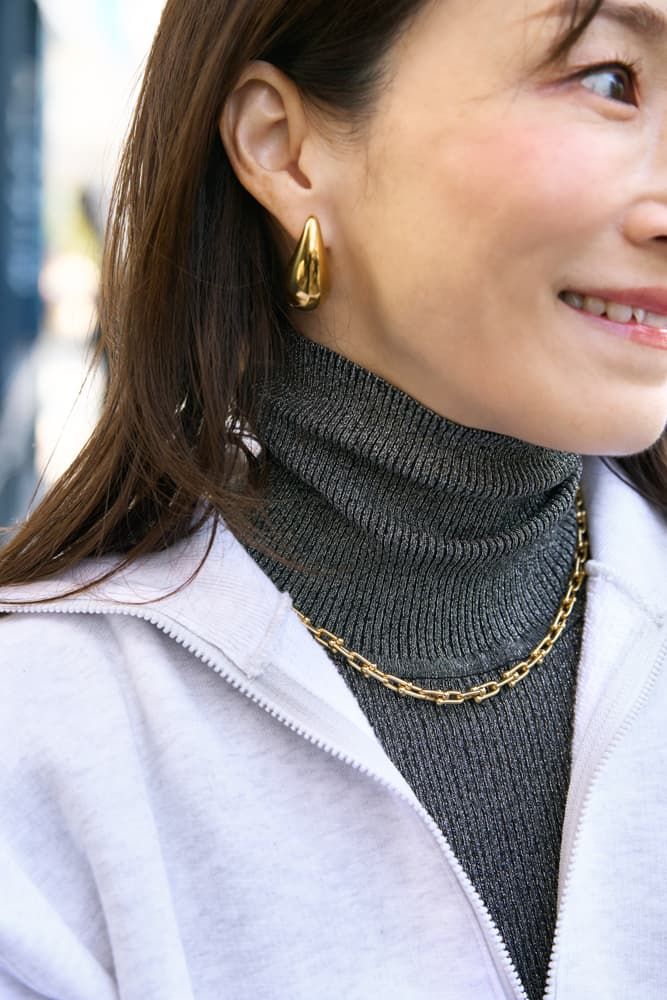 ゴールドのジュエリーもボリューム感のあるものがタイプ。次々購入するのではなく、本当に長く愛せるアイテムとの出会いを大切にしています。