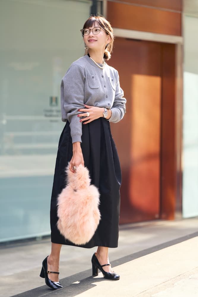 グレーのシンプルカーディガンに黒スカート、黒パンプスとモノトーンでクラシカルな雰囲気なので、バッグとジュエリーでレディに仕上げました。パールのネックレスは後ろでリボン結びするタイプで、その日のコーデに合わせて長さを調節できます。時計は華奢なものよりも大きめが好み。お気に入りのパシャはほぼ毎日つけています!