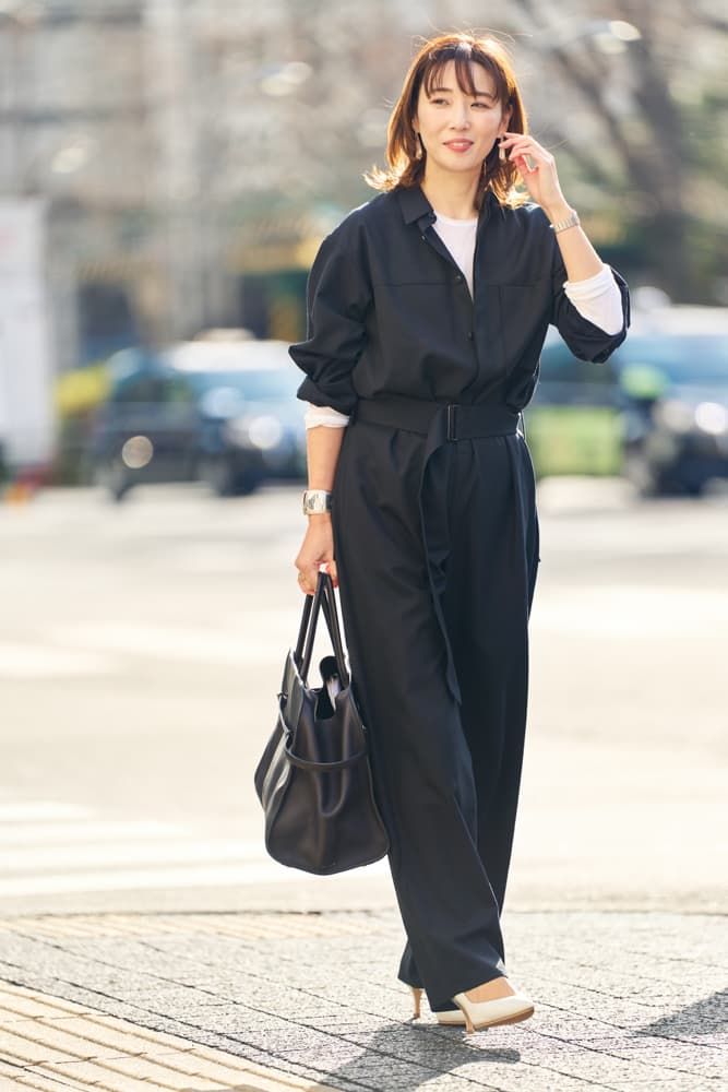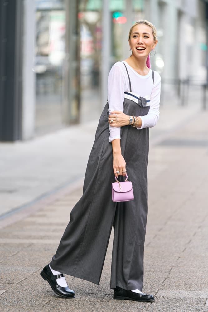 最近は甘いファッションよりマニッシュなコーデがしっくりくるようになってきました。メンズライクな洋服にジュエリーを効かせるコーディネートが多いです。ダークカラーでメンズっぽいシルエットのオールインワンには白アイテムとボリュームのあるシルバーアクセを合わせ、軽さと女っぽさをプラスしました。