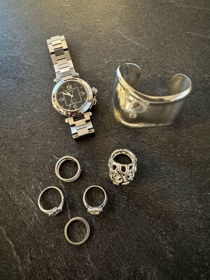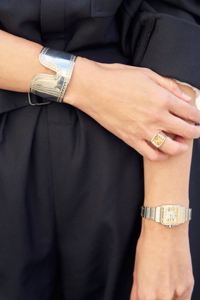 シルバーのスタメンジュエリーは、シルバーの靴やバッグを合わせたい日に登場します。こちらもゴールドのスタメン同様、大きくてゴツいものが多め。Tiffanyのバングルは、ライターとして初めて一人で担当した企画のギャラで購入した思い出の品です。