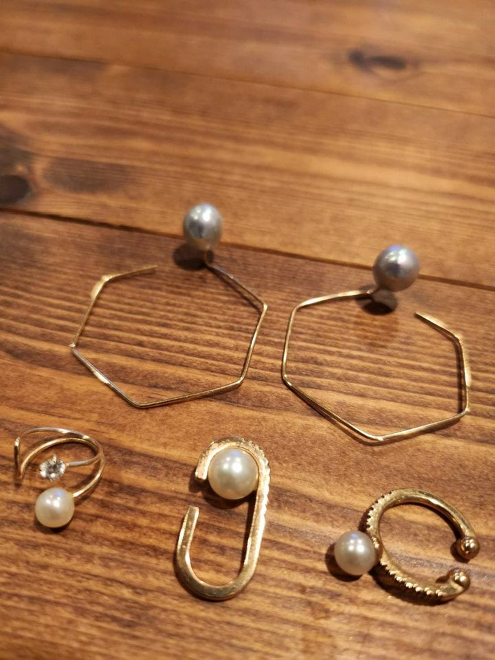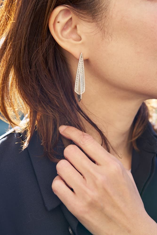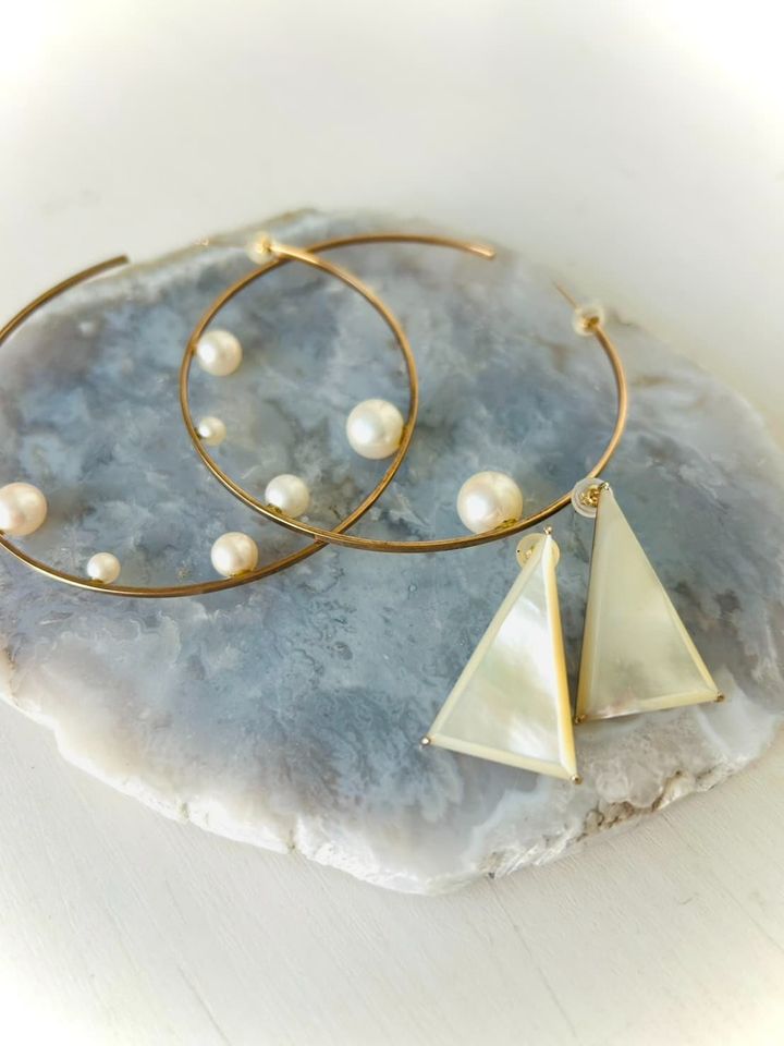 存在感のあるピアスなので耳元を主役にしたい時に使います。パールとシェルの白い光が顔周りを華やかにしてくれます。これらをつける時はアップヘアにして、シンプルな服のスパイスとして選びます。