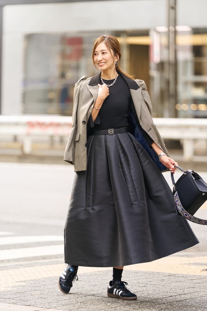 ドラマティックなスカートが主役のブラックワントーンコーデ。マニッシュなチェック柄のジャケットを羽織って甘さを中和、ほどよく崩してみました。足元もスニーカーでよりカジュアル増しに。カジュアルdayにはシルバーのジュエリーが大活躍! シルバーベースに少しのゴールドミックスで奥行きを出す合わせ方が気に入っています。