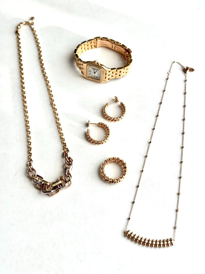 ジュエリーはコレ!と思ったものをほぼ毎日着用、自分の定番と言える数点を長年愛用しています。イエベなので顔色が映えるイエローゴールドのものが多いです。ファッションは甘めが多いけれどジュエリーは太いチェーンや大ぶりのピアスなど辛口なものが好み。ゴツめジュエリーを甘コーデの引き締め役にしています。